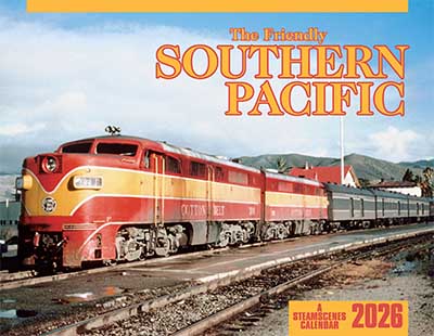 This beautiful calendar is of vintage steam and diesel locomotives from the Southern Pacific Railroad. It's for the year 2026. Published by Steamscenes.