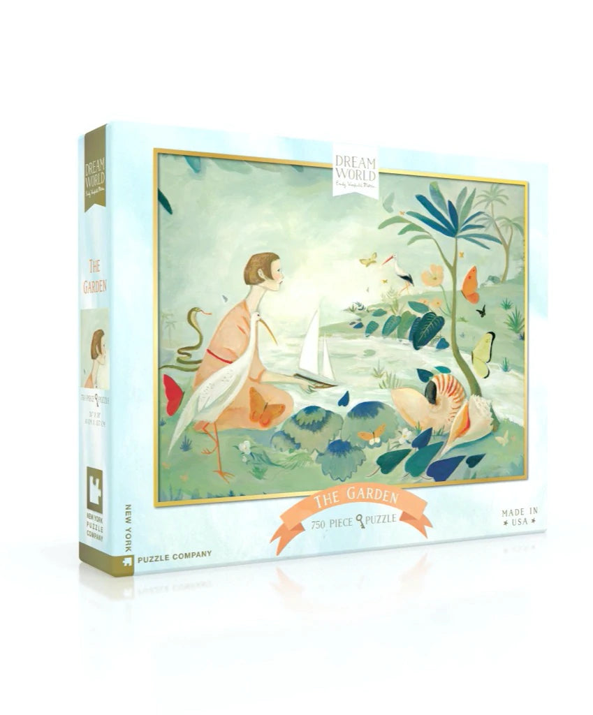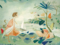 From American artist Emily Winfield Martin's Dream World, a girl prepares to launch her toy boat into a stream, surrounded by colorful butterflies, animals, and shells.