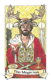 The shining strength of this deck lies in the fifty-six cards of the Minor Arcana. The characters on the cards almost seem to breathe. Often, the cards seem so dimensional you get the feeling you could jump into them. Watch the boy carve pentagrams on wooden disks in the eight of Pentacles. Gleefully help steal blades in the five of Swords. Join in the merry dance on the four of Wands.