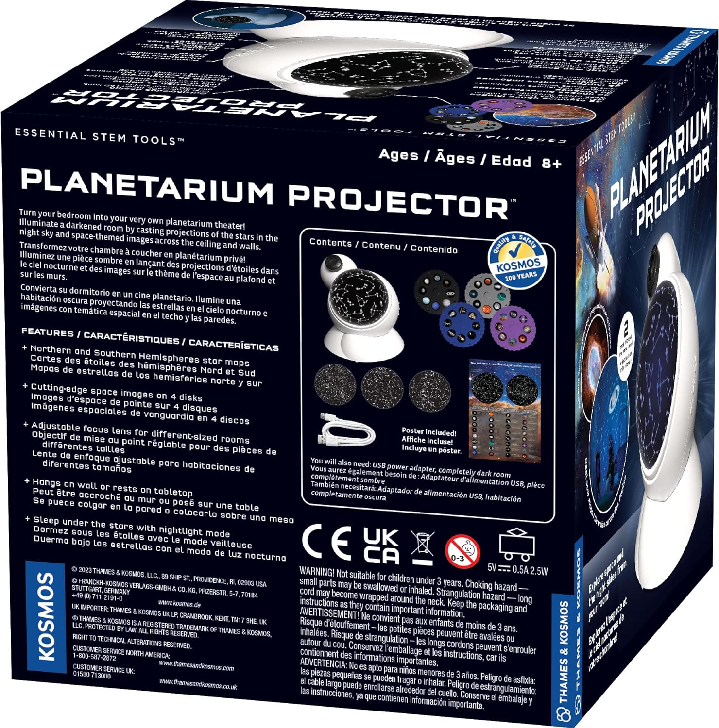 The second projects space-related images, including all eight planets, eight human-made space objects like rockets and satellites, and eight extragalactic phenomena like nebula and galaxies. Use nightlight mode to automatically shut off the projector after 15, 30, or 60 minutes. The compact, space-saving design can be placed on a flat surface or hung on a wall. Includes color educational poster and instruction sheet.