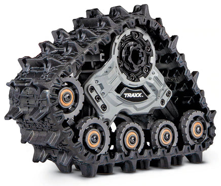 The new all-terrain Traxx provides the most significant traction upgrade you can make to the TRX-4. The TRX-4 already has a go-anywhere attitude and the gear to match, but installing a set of Traxx yields a machine that feels practically unstoppable on virtually any terrain. The enormous contact patch and grippy treads shrug off the deepest mud and float across deep sand. Traxx raises the portal axles even higher (over 16mm!) for increased ground clearance that lets you straddle huge obstacles on the trail. Each Traxx drive unit is engineered for rugged, yet smooth performance. An adjustable tension wheel keeps the treads tight while suspended road wheels allow the tread to conform to surface irregularities for maximum traction. Oil-filled dampers on each drive unit control rotational movements to help keep the tread glued to the surface. The rear Traxx drive units are longer to allow climbing steeper grades with authority.