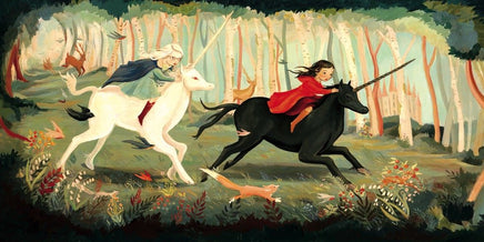 Riding through the castle's bountiful woods with critters along side, the children gallop atop their magical unicorns.