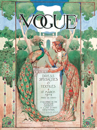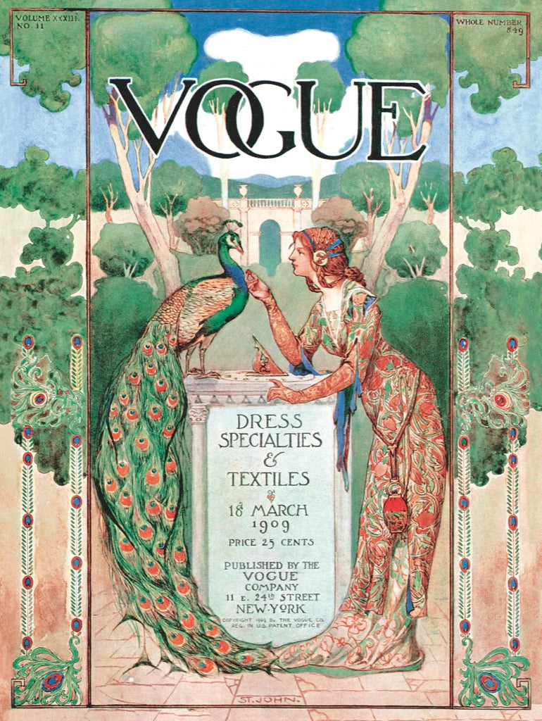 Chicagoan J. Allen St. John would become known by many as the “Godfather of Modern Fantasy Art,” but the romantic cover he created for Vogue’s March 18, 1909, Dress Specialties & Textiles issue hewed closer to reality than might be expected (aside from the pet peacocks, perhaps). As readers flipped through the pages of the magazine, they were informed that “the medieval in dress is gaining ground in many trifling ways—for, as the fashions progress, it is seen that the designers are getting their inspiration almost daily from middle Europe of the fourteenth and early fifteenth centuries, and even back into the tenth.” This time traveling, noted Vogue, “is of more than historical interest . . . it is of real value . . . to one who aims not only at being dressed smartly, but also with real distinction, with ‘style’ instead of ‘fashion’”—the holy grail of the bon ton.