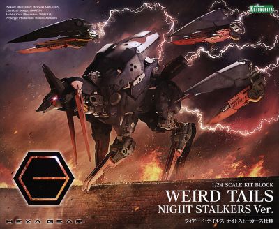 This kit is a variation kit of Weird Tails featuring a different color scheme with Night Stalkers emblem decals included. In addition to two sprue F Dark Silver Ver. with optional molded grapple blades, the kit includes sprue E Dark Silver Ver. allowing for a variety of customization possibilities. The Night Stalkers emblem decals come in multiple sizes for use on HEXA GEAR and Governors, including a special-sized decal for the shoulder armor of the Early Governor Vol. 1 Night Stalkers model kit.