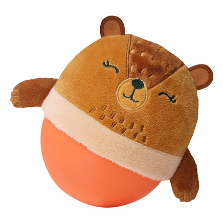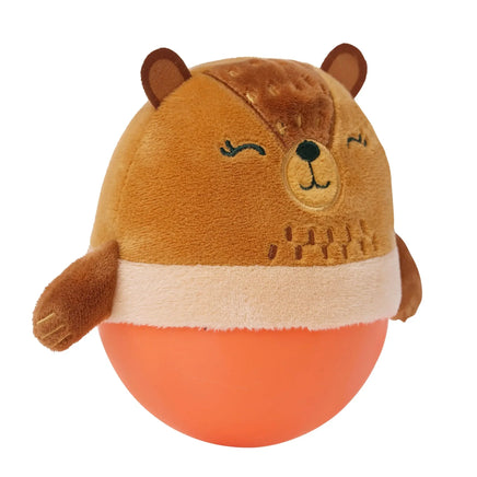 It wobbles, it bobbles and bounces without fail! The Wobbly Bobbly Bear has a one-of-a-kind design that features a weighted soft silicone base for optimal wobbling and bouncing that always wobbles back to an upright position. Its unique silicone base offers a soft squishable texture that's safe for baby play. This silicone design is unlike any other wobble toy on the market. The upper half of this little bear features plush fabric with embroidered facial features and a bell inside for added enjoyment. Encourages cause and effect learning and motor development.