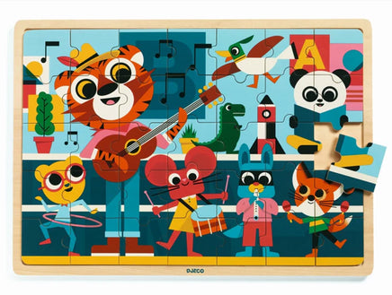 An ideal introductory jigsaw puzzle – gather the 35 pieces and reassemble the band. How many instruments can you discover? The sturdy wooden pieces neatly fit the puzzle base, ensuring organization and ease. Designed for small hands, these pieces are the perfect size.