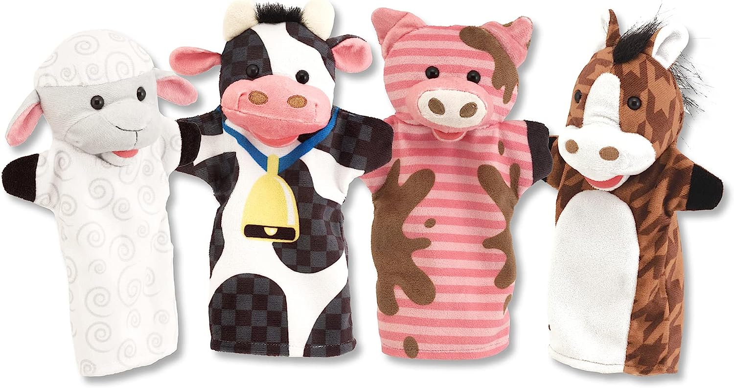 Four soft hand-puppets in a wild-animal theme to spark imaginative play